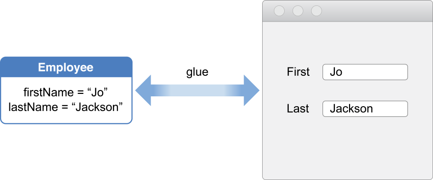 In the simplest functional sense, the Cocoa bindings technology provides a means of keeping model and view values synchronized without you having to write a lot of “glue code.” It allows you to establish a mediated connection between a view and a piece of data, “binding” them such that a change in one is reflected in the other.
