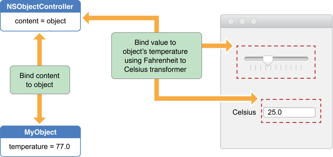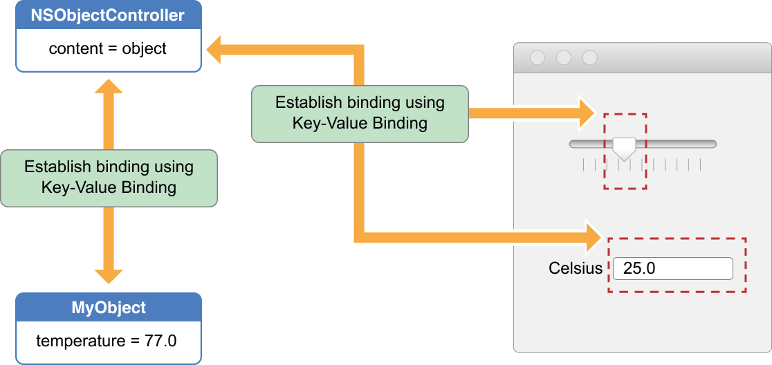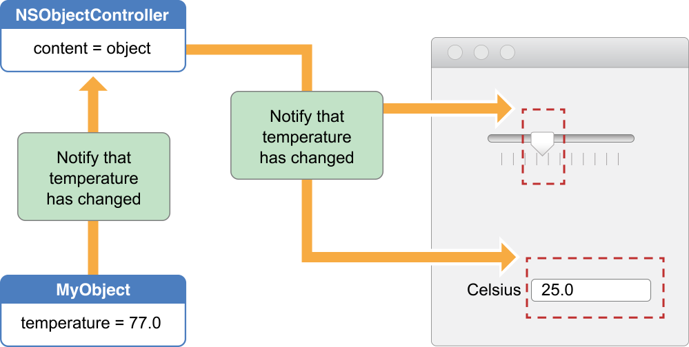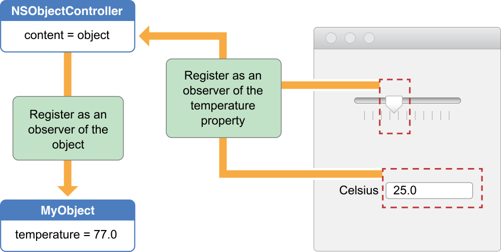 Key-value observing is a mechanism whereby an object can register with another to be notified of changes to the value of a property. When one object is bound to another object, it registers itself as an observer of the relevant property of that object. In the current example, the text field and slider register as observers of the temperature property of the controller’s content, as illustrated in Figure 9.