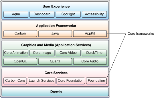 Architecturally, OS X is a series of software layers going from the foundation of Darwin to the various application frameworks and the user experience they support. The intervening layers represent the system software largely (but not entirely) contained in the two major umbrella frameworks, Core Services and Application Services. A component at one layer generally has dependencies on the layer beneath it. Figure 1-1 situates Cocoa in this architectural setting.