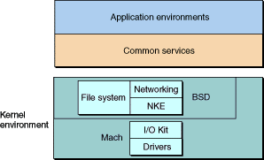 In OS X, however, the kernel environment contains much more than the Mach kernel itself. The OS X kernel environment includes the Mach kernel, BSD, the I/O Kit, file systems, and networking components. These are often referred to collectively as the kernel. Each of these components is described briefly in the following sections. For further details, refer to the specific component chapters or to the reference material listed in the bibliography.