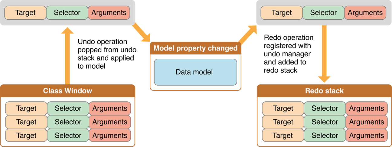 This message causes the undo manager to construct and save an invocation. If the user later chooses Undo, the saved invocation is invoked and your model object receives another setColor: message, this time with the old color. You don’t have to keep track of whether commands are being undone to support redo. In fact, the way redo works is by watching what invocations get registered as the undo is happening and recording them on the redo stack.