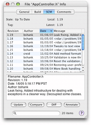 The SCM pane in the inspector or a file’s Info window contains a list of each revision of the file. The information displayed in the list includes the revision number, the author, and a message about the changes made. The change message may be truncated in the list. To see the entire change message for a revision, select the revision in the revision list. The change message, as well as the other properties of the list, appears in the text field below the revision list. Figure 22-11 shows the revision of a file in an Info window.
