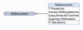 • Rolled up, so that just the name of the class or entity is showing. This gives the most compact representation, with maximum information density in the diagram. (In Figure 10-3 the NSDocument node is rolled up.)