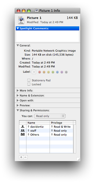 Fundamentally, identities are used to control who has access to files and services. If you view the Get Info panel on a file in the Finder, you’ve seen the Ownership and Permissions section (Figure 1-2). This section displays what access users and groups have to the file or folder. These permissions (no access, read only, or read and write) are stored in an access control list (ACL). Every single folder and file on your computer has an associated ACL. Thus you can create very specific, customized access permissions for the files on your computer.