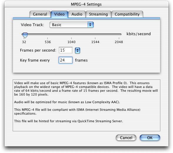 • QuickTime 6 also supports use of the MPEG-4 video and AAC audio codecs in QuickTime movies. In many cases, you can choose to create either a native .mp4 file or a QuickTime .mov file using MPEG-4 compression. This allows you to mix MPEG-4 audio and video with other QuickTime media, such as VR panoramas, sprites, or Flash tracks. Discussed in the section MPEG-4 and Web Developers.