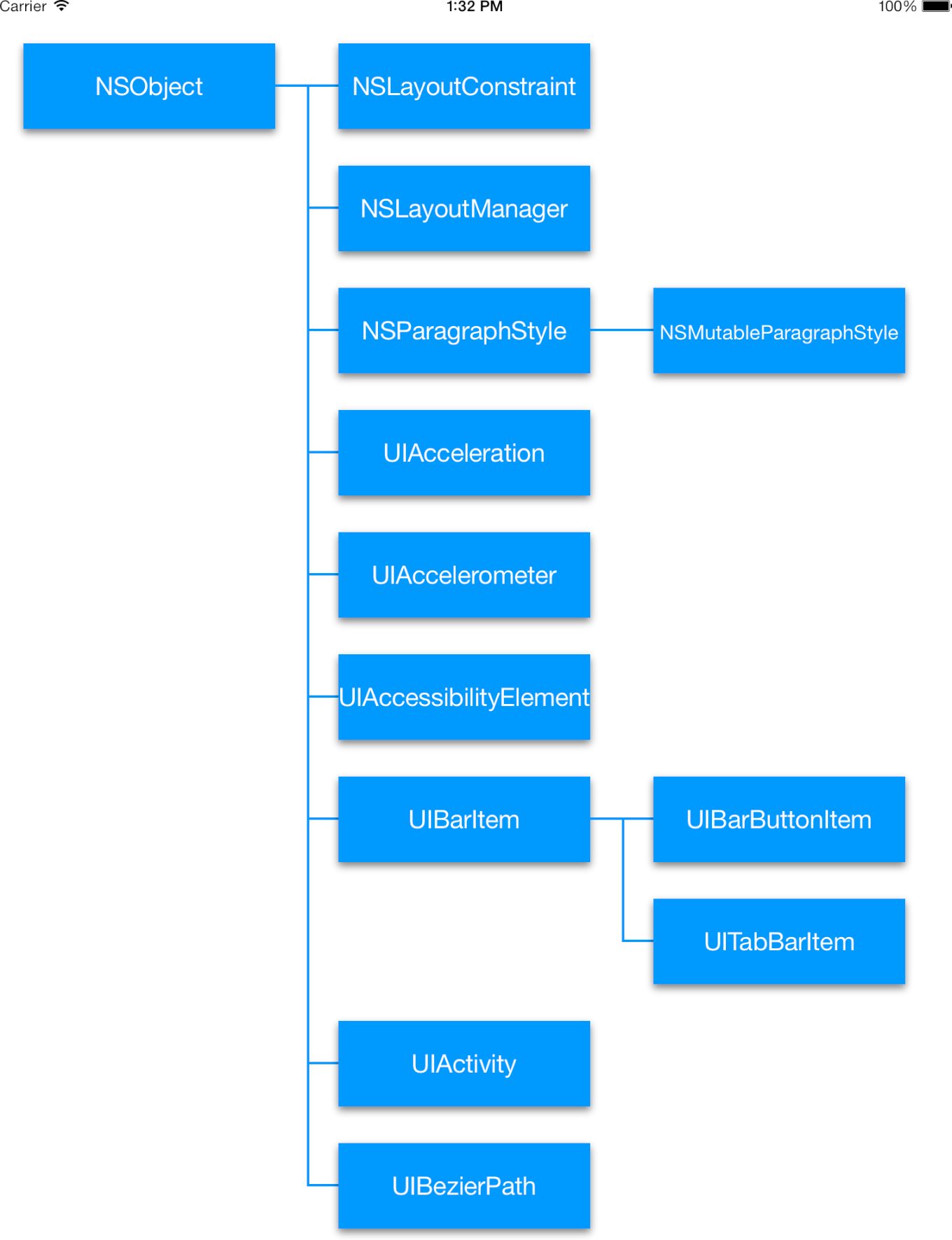 The purpose of this worked example is to implement a custom layout for displaying a hierarchichal tree of information such as the diagram seen in Figure 6-1. The example provides snippets of code followed by an explanation of the code, along with the point in the customization process you have reached. Each section of the collection view constitutes one level of depth into the tree: Section 0 contains only the NSObject cell. Section 1 contains all of the children cell’s of NSObject. Section 2 contains all of the children cells of those children, and so on. Each of the cells is a custom cell, with a label for the associated class name, and the connections between cells are supplementary views. Because the connector view class must determine how many connections to draw, it needs access to the data in our data source. It therefore makes sense to implement these connections as supplementary views and not decoration views.