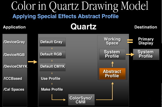 In terms of color processing, the application can request Quartz to render data in any of the PDF color spaces. To accomplish that, Quartz will convert all these into ICC profiles. Default profiles are selected by Quartz, but can be overridden by the application. Quartz will do all compositing in the working space, and ColorSync will be invoked to perform color transformations from any of the source color spaces to the working space. Finally, when compositing is completed, the rasterized data will be sent to the desired destination. Naturally, if the color space of the destination doesn't match the working space, and additional conversion must be done.