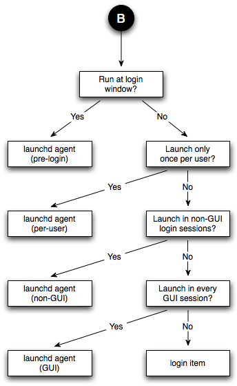 Agents have acquired a variety of different names over the years. These include background-only applications (BOAs), faceless background-only applications (FBAs), and UI elements (implying that the agent displays some GUI, but is not a full blown application with a menu bar). These names are more-or-less irrelevant to this discussion. What is relevant, and what distinguishes different types of agents, is how the agent is launched.
