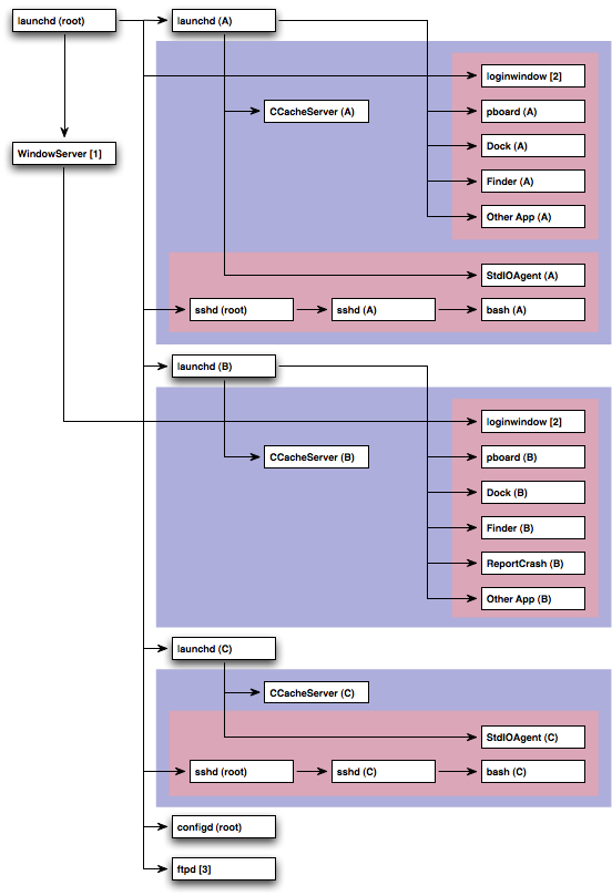 In this diagram there are three per-session bootstrap namespaces, two for GUI login sessions (users A and B) and one for an SSH login session (user A). These are represented by red boxes. Items that aren't in any red box are in the global bootstrap namespace.