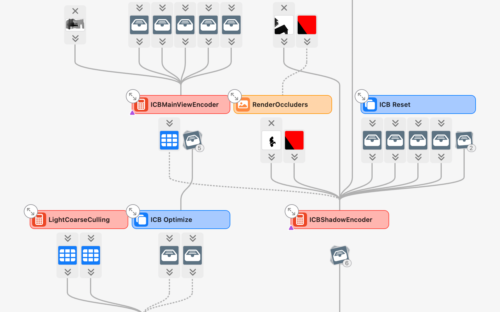 The dependencies viewer provides a graphics representation of the structure of your Metal workload and allows you to view relationships between resources, passes, synchronization primitives, and individual encoder stages like vertex and fragment.