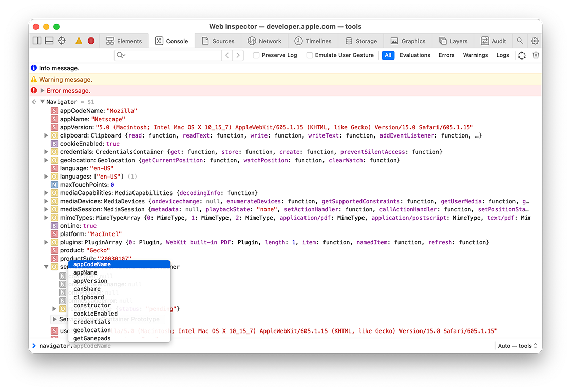 Console. Type JavaScript commands in the console to interactively debug, modify, and get information about your webpage. View logs, errors, and warnings emitted from a webpage, so you can identify issues fast and resolve them right away.