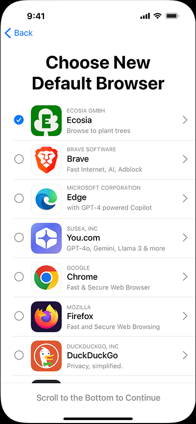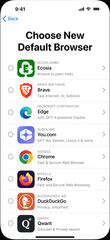To meet the requirements in the Digital Markets Act (DMA) in the European Union, iOS and iPadOS include a choice screen that provides an additional way to choose a default web browser from a list of options. The screen is displayed the first time a user in the EU opens Safari on their iPhone or iPad running a minimum of iOS 17.4 or iPadOS 18.2.