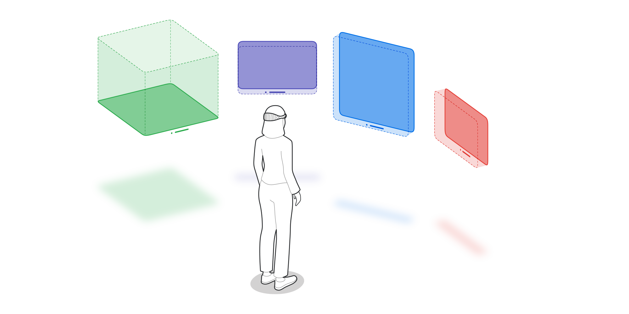 By default, apps launch into the Shared Space, where they exist side by side — much like multiple apps on a Mac desktop. Apps can use windows and volumes to show content, and people can reposition these elements wherever they like. For a more immersive experience, an app can open a dedicated Full Space where only that app’s content will appear. Inside a Full Space, an app can use windows and volumes, create unbounded 3D content, open a portal to a different world, or even fully immerse people in an environment.